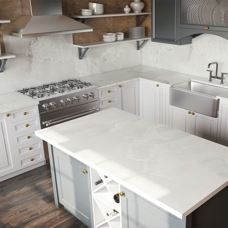 Dekton Helena är ett vackert kompositmaterial inspirerat av onyxens naturliga skönhet. De genomskinligt vita och mjuka grå nyanserna skapar ett ljust, elegant uttryck med subtilt djup. Den blanka ytan förstärker materialet levande karaktär och ger ett sofistikerat lyster.