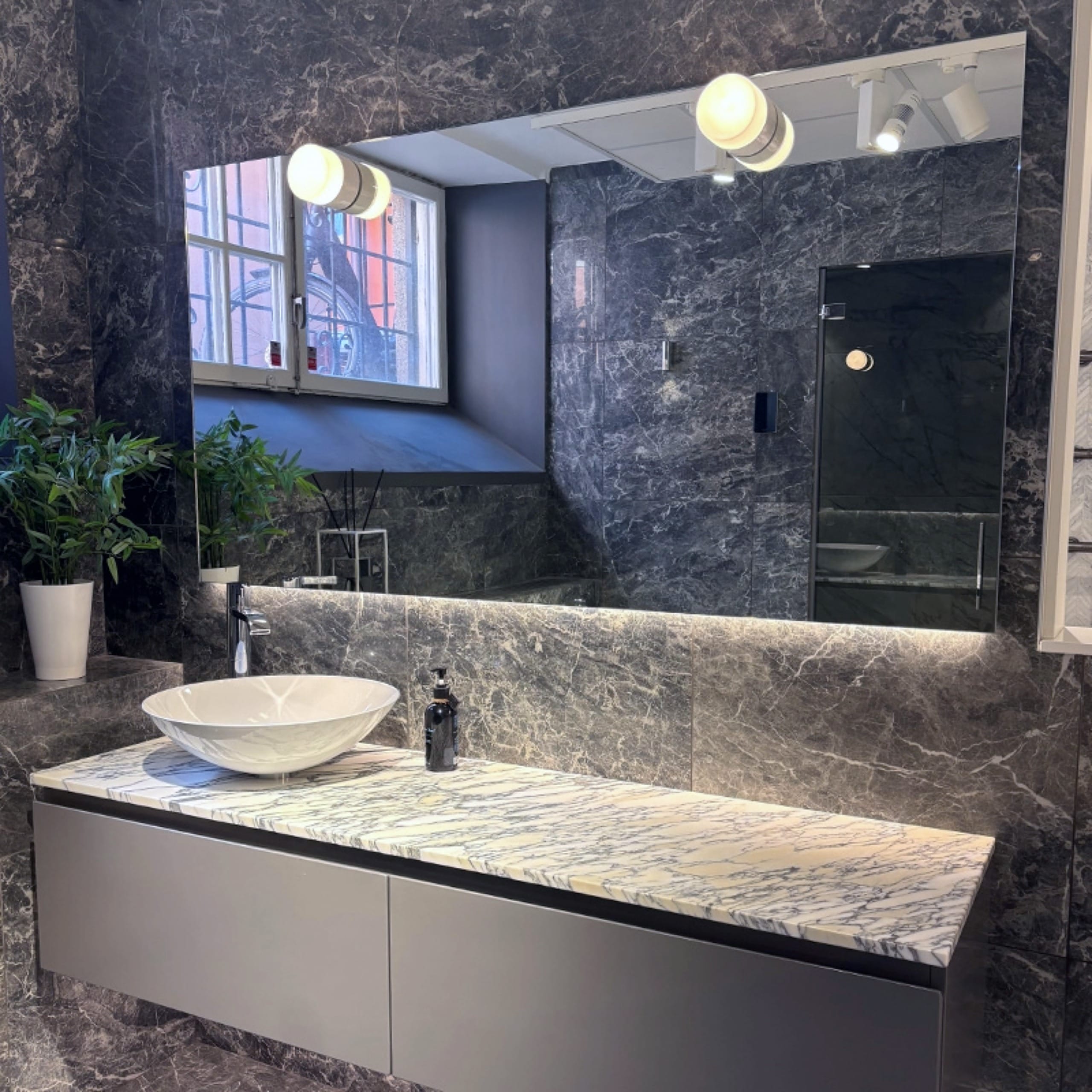 Gålö spegel inkl. underbelysning och Opus spegelbelysning med vita skärmar.