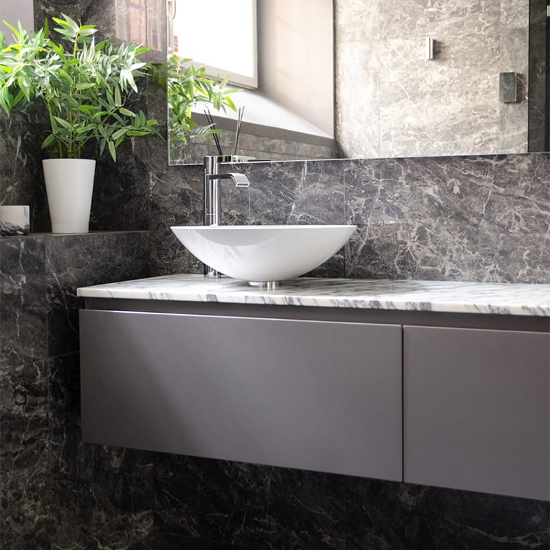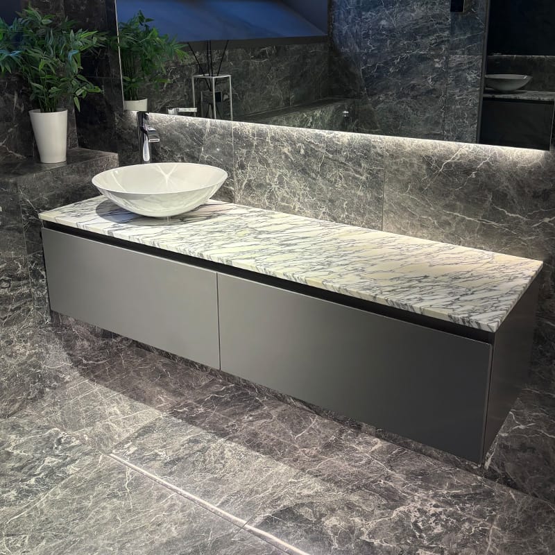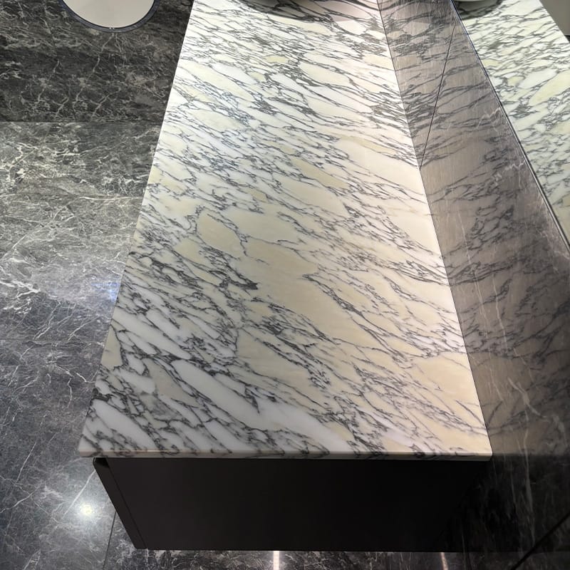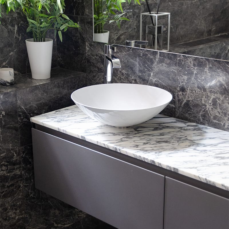 Bänkskivan i Arabescato marmor ger karaktär med sina tydliga ådringar där varma och kalla toner möts. Det gör den lätt att kombinera med olika materialval och färger i rummet, oavsett om du föredrar en ljus eller mer kontrasterande stil.