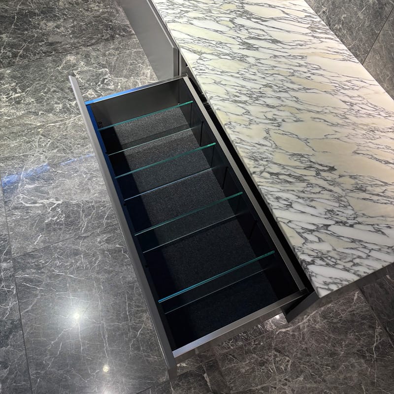 Kommoden är designad av oss och finns att se här i vårt showroom. Kommoden är i en djup grå nyans och erbjuder generös förvaring och gott om avställningsyta. Underskåpet rymmer två breda lådor med integrerad grepplist och släta fronter som skapar en ren och minimalistisk känsla.