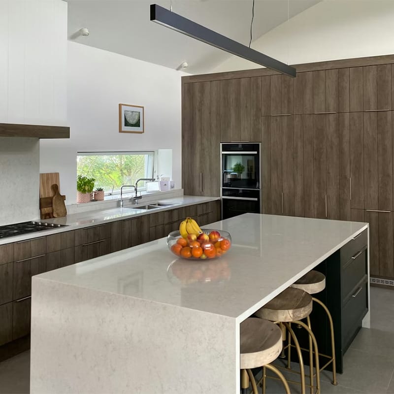Silestone Snowy Ibiza är ett kompositmaterial med polerad yta och ett ljus, exklusivt uttryck. Den vita basen bryts varsamt av med mjukt grå, marmorliknande ådringar som ger ytan ett tidlöst och harmoniskt intryck.