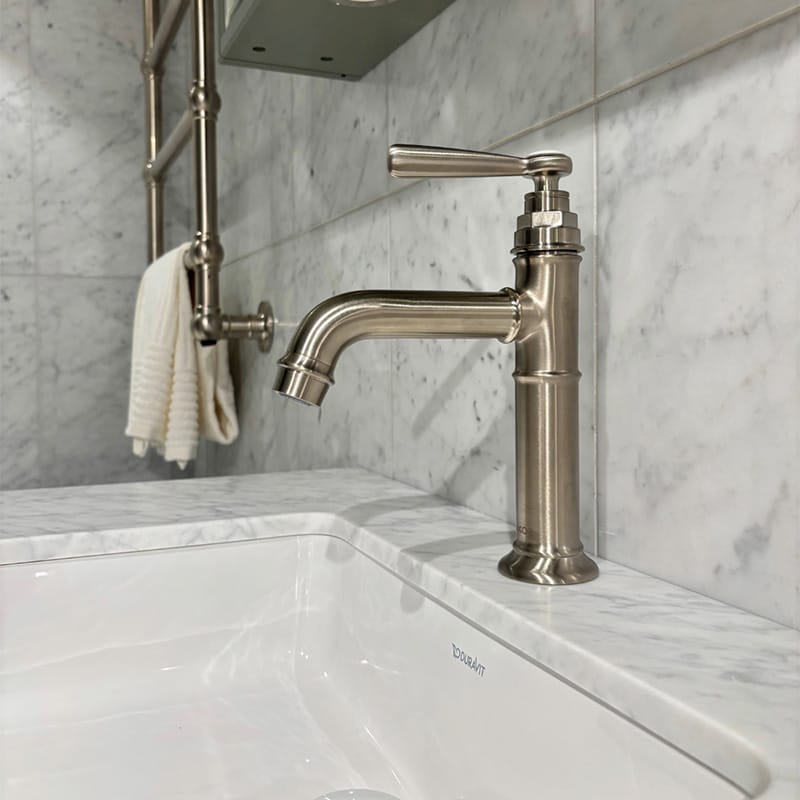 Tvättställsblandare för montage på tvättställ eller bänkskiva. Blandaren har en klassisk design, och passar väl in i ett badrum inrett i sekelskiftes- eller lantlig stil.